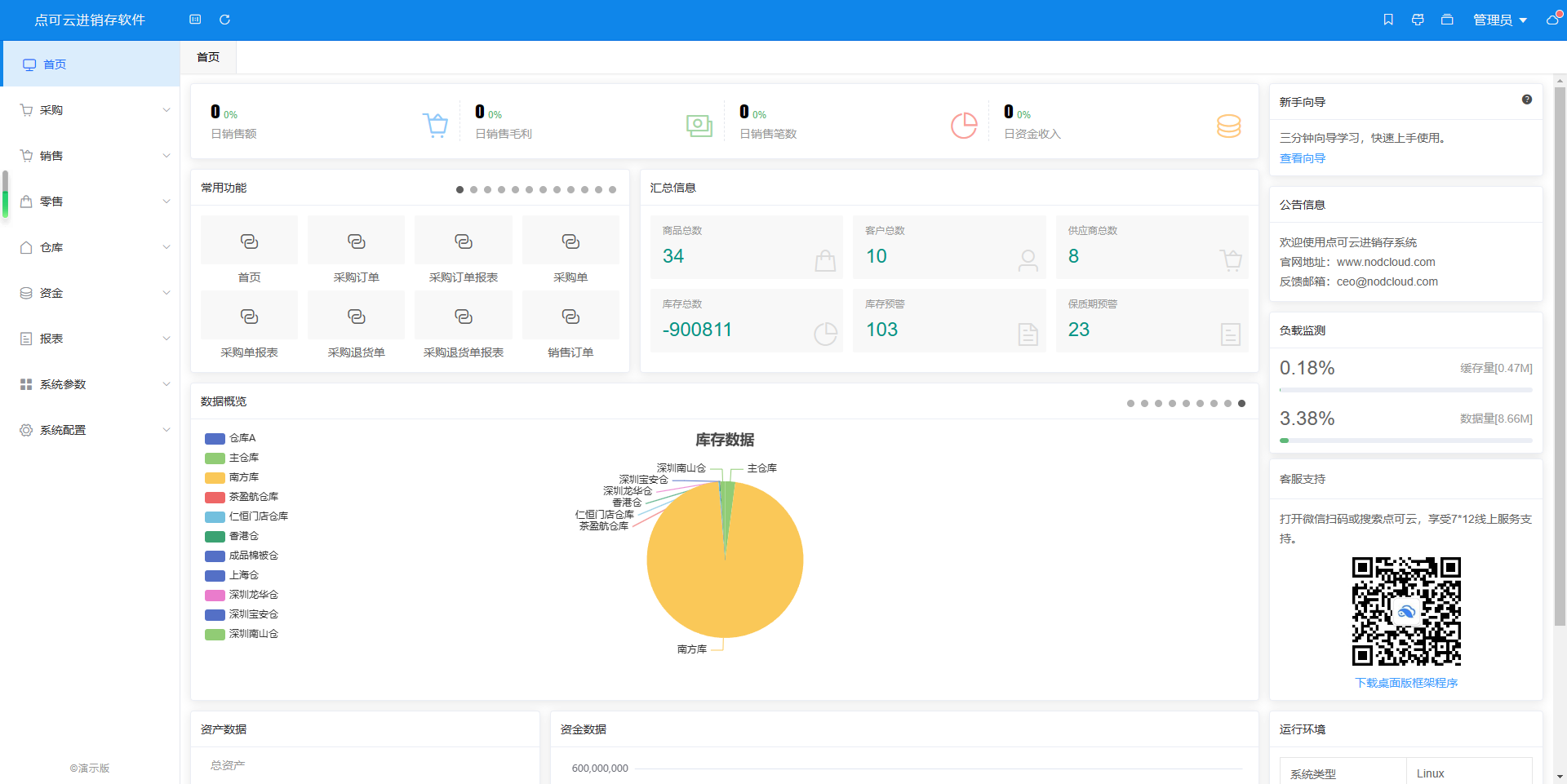 数据模块包括:每日系统部分数据统计、常用功能、汇总信息、数据概览、资产数据和资金数据,这些数据展示可以帮助您了解企业的运营情况和财务状况。注:常用功能可理解为快捷功能,每个用户可根据自己对某一功能的使用频率添加到常用功能中,添加操作在辅助资料中的常用功能内。