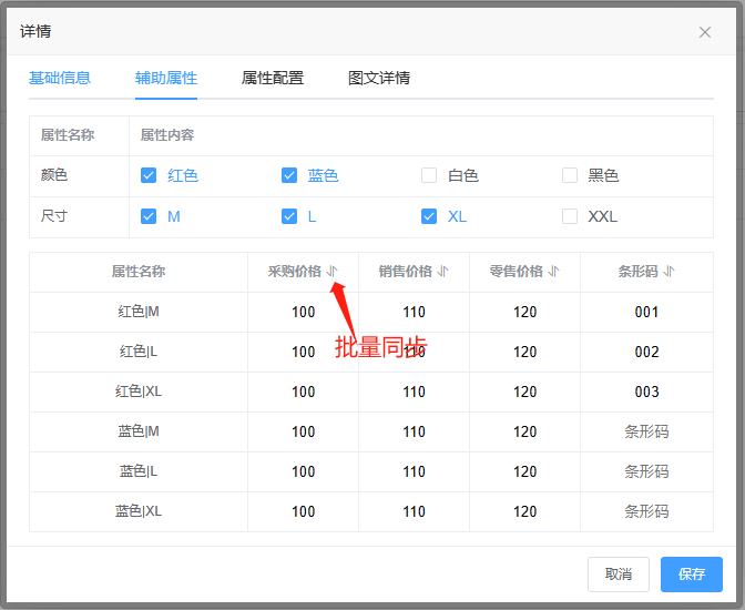 辅助属性是商品的特殊属性,例如商品的型号、尺寸、颜色等等都属于是辅助属性,选择后可以搭配不同的型号内容,同时也需要给每一条属性填写对应的价格,如果价格相同可点击“箭头”按钮同步基础信息内的价格,在单据中选择辅助属性的商品时,价格显示优先显示辅助属性价格,没有辅助属性的商品,会显示基础信息中的价格(辅助属性内容在辅助资料中添加)。