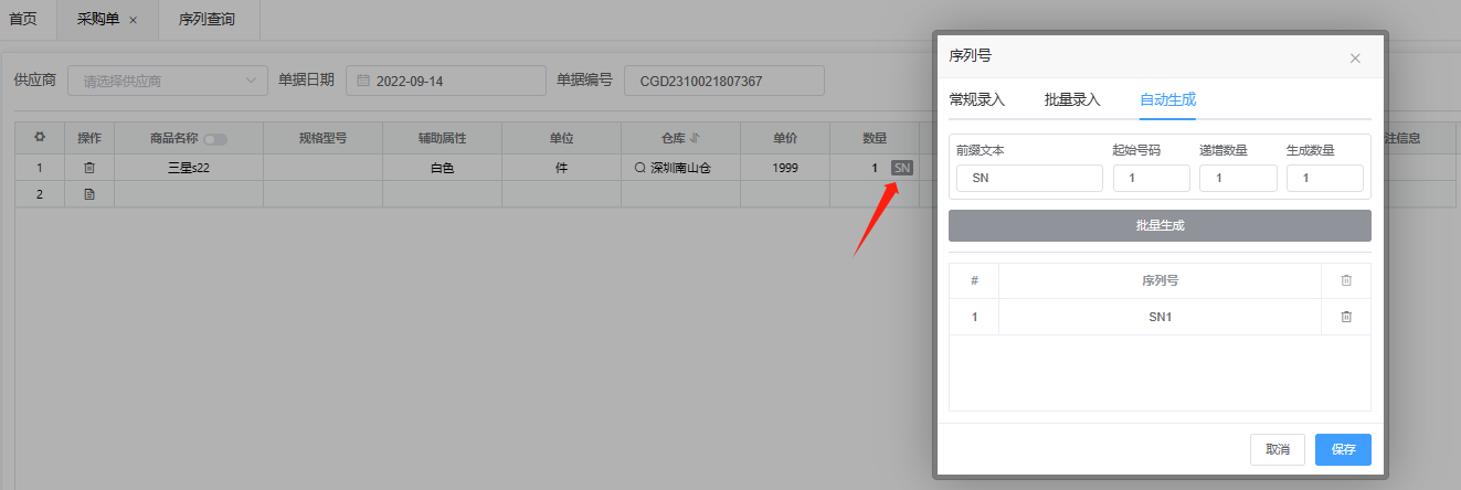 序列商品适用于存在序列号的商品使用,例如各类电子产品,开启后在采购单中添加该商品,就需要填写商品序列号,一个商品对应一个序列号,添加商品后,点击数量后的 “SN” 打开序列号录入界面,此处有三种录入方式,常规录入手动或扫码录入,批量录入,批量填写序列号一行一个,然后点击批量添加,自动生成,填写序列号规则,然后批量生成序列号,填写完成后点击右下角保存即可。