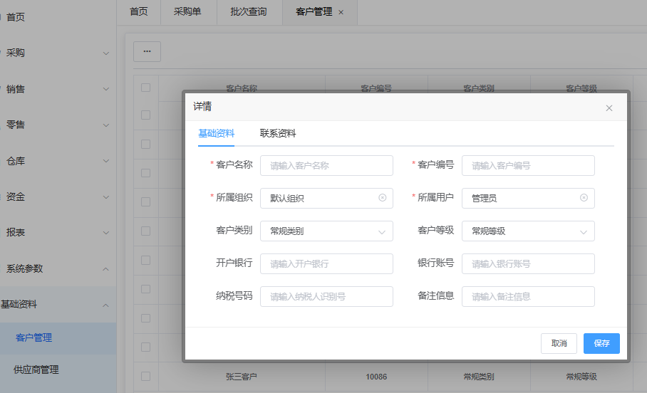 客户管理信息分基础资料和联系资料两部分, 在基础资料中需要注意 “所属组织” 和 “所属用户”,在高级设置的角色设置中 会根据使用者的实际业务逻辑来分配角色,角色配置中将涉及数据权限, 可根据组织(部门)来分配数据, 例如: 某A客户属于 销售1组 客户,B客户为销售2组,在数据分配时 1组能获取到的数据只有A客户 而查看不到B客户内容, 以及所有和 B客户 关联单据都查询不到。所属用户也是同理,用户针对的只有用户自己了, 用户只能查看到自己创建的客户。“客户等级”默认为常规等级,新建等级需要在高级设置 的 系统设置中添加,客户等级关联商品折扣信息, 根据不同等级所获得的折扣来分配给客户(商品管理属性配置中有提到),“客户类别” 也需要在系统设置中添加创建, 客户类别通常根据不同的标准和业务需求进行分类。例如:行业类型(零售,食品,服装针织等)、战略重要性(战略重要客户,重要客户,一般客户)、地理位置(山西区域、北京区域等),根据企业的具体情况和业务需求进行调整和定制。通过客户分类,企业可以更好地了解和管理不同类型的客户,制定相应的营销策略、提供个性化的服务,并实现更高的客户满意度和业务增长。