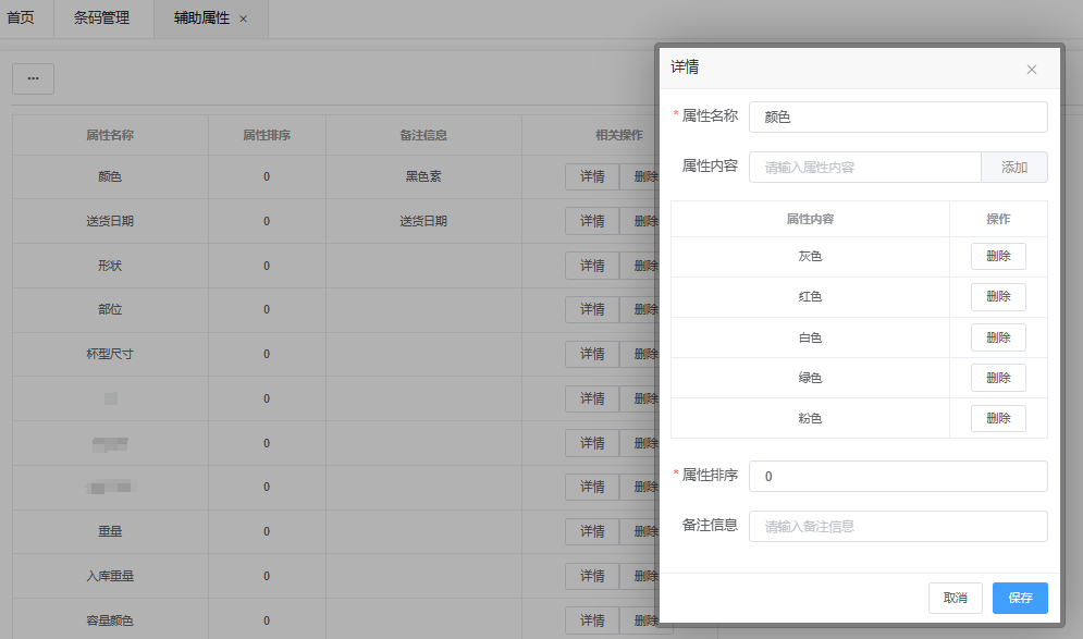 辅助属性为商品新增时选择的属性内容,属性名称可理解为一种类型,例如:颜色、尺码、材质等,属性内容则例如: 颜色中可记录红色、黑色、蓝色...等,填写完成后,点击添加到下面列表中,可以根据需求添加,没有数量限制。