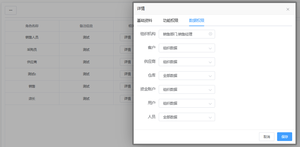 - 数据权限配置:数据内容包括:客户、供应商、仓库、资金账户、用户和人员,选择范围有:全部数据、组织数据、用户数据。全部数据顾名思义为系统全部数据都可查看获取,组织数据则为角色勾选设定的组织数据,用户数据为当前登录用户自己创建的数据。