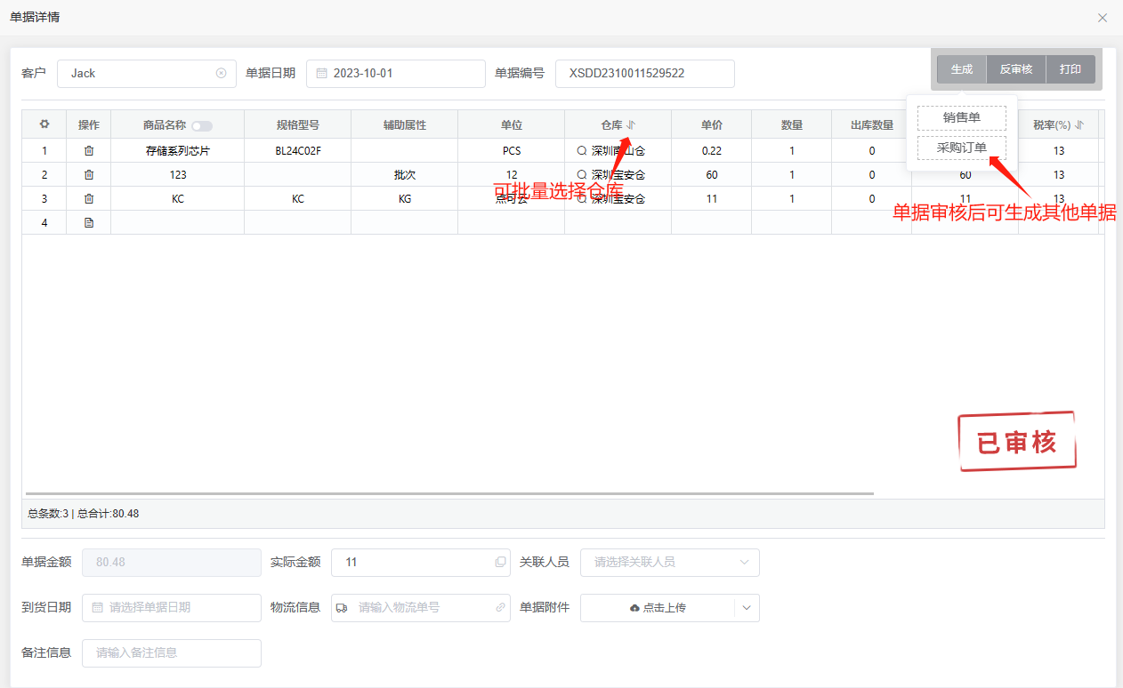 自动审核,开启后保存单据会自动审核,无需二次操作再审核。