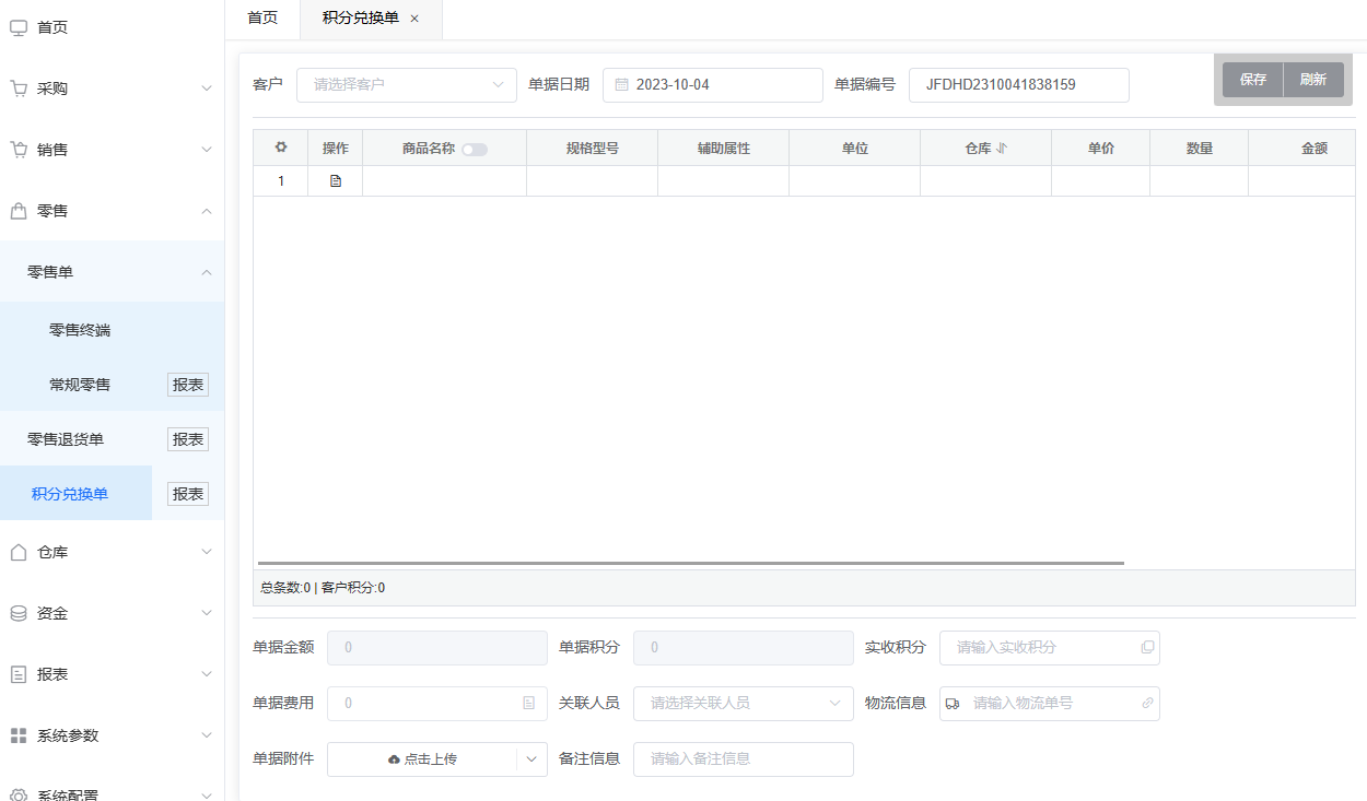 积分兑换单是客户使用积分兑换商品时使用的单据,多用于商超类型销售,积分兑换单是不涉及任何资金的,只有商品的出库功能,积分兑换的商品不可进行退货操作,单据顶部以及商品选择表格与常规零售单一样,必填项有客户、日期、编号,选择客户后在表格底部的统计中可以看到客户积分有多少,或者在客户管理中也可看到客户积分,底部必填项有实收积分、关联人员,其它为选填项,积分兑换比例可在系统设置中的零售参数设置;商品选择和其他单据一样,单据填写完整即可保存,保存单据后会显示审核、核对、打印按钮,三个按钮是对该单据的操作,审核后该单据中的商品才会进行商品出库,客户积分减少操作。