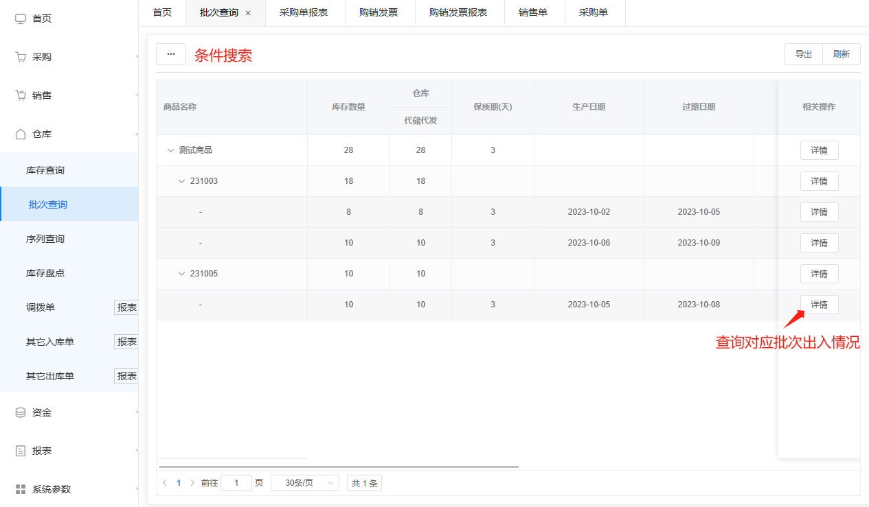 每一批次代表了一次物料的采购、生产或销售过程。批次查询功能允许用户根据批次号或其他相关条件,追踪和查询特定批次的相关信息,如批次号、生产日期、保质期等。系统默认展示所有的批次商品(常规批次),可在搜索条件中选择 “预警批次” 来查询已预警商品,首页 " 汇总信息 - 保质期预警 " 点击查询则是跳转到批次查询页面 “预警批次” 条件查询。