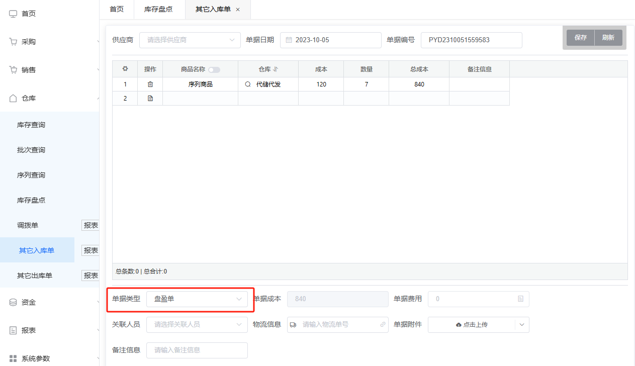 其他入库单操作和采购单一致,但其他入库单供应商为选填项,单据只记录有单据金额和单据费用,其他出库单同理。其他出入库单只发生商品库存的增减,添置单据时需选择单据类型,盘盈单、盘亏单是在库存盘点时使用的,可查看库存盘点信息。其他出入库单是一种通用的出入库单据,用于记录不属于特定类型的商品进入仓库的情况。例如: 赠品入库,样品入库,一些固定消耗材料(螺丝扳手电线、办公用具等)。
