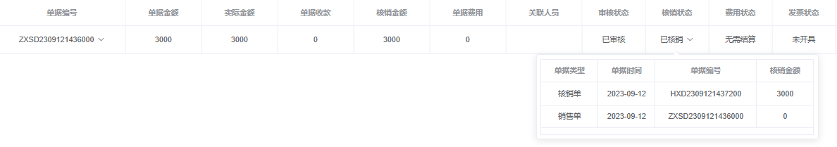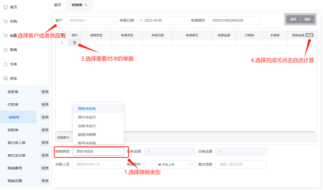 实际操作: 操作时先选择底部需要操作的核销类型,然后选择客户或供应商,点击操作按钮,选择对冲的至少两个或多个单据进行对冲核销,然后填写核销金额,或者可点击核销金额后“自动”按钮,系统将自动计算核销金额,填写完成后保存审核即可完成核销操作,核销单报表中可以查看所有保存的核销单据,左上角搜索可以多维度查询所有单据,审核完成后所对应的核销单据状态也会随之改变。核销成功后,对应单据将同步更新核销状态,已核销则为订单金额交付完成。